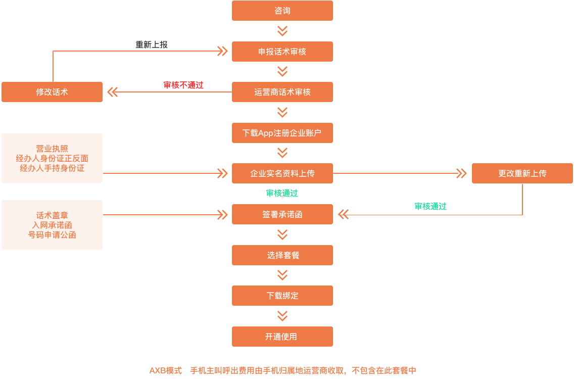 1.创建企业账户前请准备好企业[营业执照]、[经办人身份证件]、[审核通过的话术加盖公章] 、[电信用户入网承诺书]、[号码申请公函],以上资料在企业实名时必须全部提供, 资料不详或缺失会造成账户审核失败。